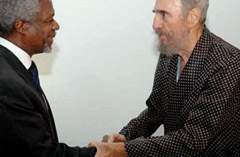 痴迷籃球喜歡棒球 古巴領導人卡斯楚也是一個體育迷,喜歡很多種體育運動,不過,最讓他著迷的是籃球。大學時代,他不但白天不停地練習投籃,還努力說服學校管理人員晚上打開籃球場的燈,專門讓他一個人練。後來,卡斯楚成了一國之尊,仍然不改對籃球的“痴情”,還經常即興衝進在街上玩籃球的孩子們中間,開心地露上一手。此外,卡斯楚年輕時還酷愛棒球運動,同時又是一個釣魚迷,曾創下不到4小時釣魚184公斤的紀錄。 風光度過80大壽 壽典活動節目安排 從11月28日起,卡斯楚的80大壽慶典活動將正式開始,主要活動包括為期三天 的題為“回憶與展望:卡斯楚與古巴”的座談會,從各個方面對這位偉大的革 命家的思想進行研討;一場有古巴及其他拉美國家著名樂手和歌手參加的名為“ 眾人之聲”的交響樂和包括瓜亞薩明小說詩歌文學作品在內的名為“瓜亞薩明給卡斯楚的擁 抱”的畫展 30多萬軍民參加盛典 12月2日,古巴將在裝飾一新的革命廣場上舉行盛大閱兵式。哈瓦那軍民30多萬人將參加這一盛大的慶典活動,慶祝卡斯楚80壽辰和他率領81名游擊隊員乘“格拉瑪”號遊艇在古巴登入50周年 知名人士聚首哈瓦那 目前,已有64個國家的1000多位知名人士確認將出席各種活動,其中包括一些國 家的前總統和現任總統、政界、科學界、文學界等方面的人士。儘管這些即將出 席活動的外國總統的名字尚未公布,但人們談論最多的是卡斯楚的摯友委內瑞 拉總統查維茲和玻利維亞總統莫拉萊斯。而在前來古巴的世界知名人士中,將包 括法國前總統密特朗的夫人、厄瓜多前總統博爾哈、聯合國教科文組織前總乾 事馬約爾等。 卡斯楚語錄 ·“有人說卡斯楚死了,一派胡言”——卡斯楚回擊死亡謠言。 ·“如今的古巴人民空前地團結一致。古巴永遠都不會在美國面前下跪”——卡斯楚在第六屆全球化與發展問題研討會的閉幕式上講話。 ·“請原諒我使用‘胖弟弟'的說法。建議他多加鍛鍊和開始節食,我是為了這位紳士的健康著想。”——卡斯楚評論布希弟弟。 ·“他真是一個蠢貨。他不知道古巴棒球隊員都是誰,也不知道他們是奧運會冠軍和世界冠軍。”——卡斯楚在得知布希禁止古巴隊赴美參加棒球賽後十分憤怒。 ·“兄弟!英雄般抵抗的紳士!太好了,一百萬個感謝(你的到來)。”—— 卡斯楚在歡迎前來探病的查維茲。 ·“中國萬歲!”卡斯楚招待胡錦濤顫抖離開輪椅高喊中國萬歲。