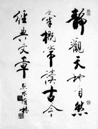 漸漸地他發現,在古人的書法下面積澱著深厚的文化底蘊,過去寫的字更多地接近側重於外在形式表現的美術字型,而中國的傳統書法則主要是文化的功力和內涵,是靈感和精神的舞動,體味出“書乃心跡,其妙在神”。那時,他不分晝夜在古帖簡帛中蕩漾暢遊,大開眼界,苦臨苦摹。加上又有機會和一些老先生接觸,如季羨林、啟功、史樹青、王世襄、徐邦達、黃苗子等。他們的言談舉止,給予了他很多無聲的啟迪。一次他向啟先生請教書法,問啟先生學哪個字型最好,啟先生則風趣地說:“你看這桌上的菜,有熘肝尖,還有熘魚片,……你喜歡吃哪種你就夾哪樣。”他又問啟先生執筆方法,啟先生說:“千萬不要看名家執筆,要多看古人的字帖,你學習歷史就要看二十四史,看懂二十四史,你就可以講歷史了,否則就永遠在別人後邊拾人牙慧。”那時羅楊還跟隨王世襄先生拍攝了《明式家具》,學習了不少鑑賞知識。他暗自下了決心,一定要“立志不隨流俗轉,留心學到古人難”。他練書法從漢隸入手,寫漢簡、寫《史晨碑》……再寫《九成宮》、《蘭亭序》……頗有那種“直造古人不到處”的執著。