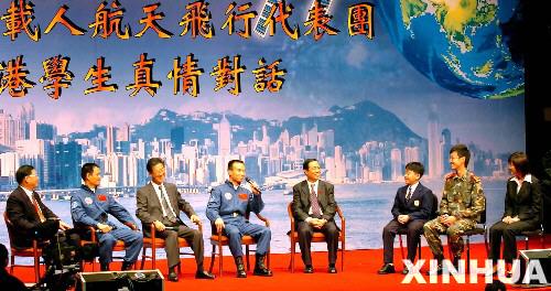 2005年11月29日 神舟六號載人航天飛行代表團與香港學生真情對話。航天員費俊龍(左四)在回答香港學生的提問。當日,由香港教育統籌局舉辦的“神舟六號載人航天飛行代表團與香港學生真情對話”活動在香港伊莉莎白體育館舉行。 新華社記者黃本強攝