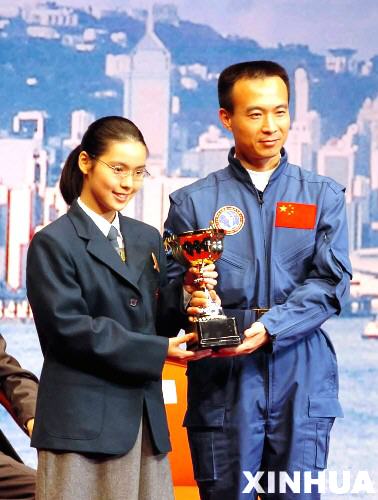 11月29日,航天員費俊龍為全港中國小生作文比賽獲獎學生頒獎。當日,由香港教育統籌局舉辦的“神舟六號載人航天飛行代表團與香港學生真情對話”活動在香港伊莉莎白體育館舉行。 新華社記者黃本強攝